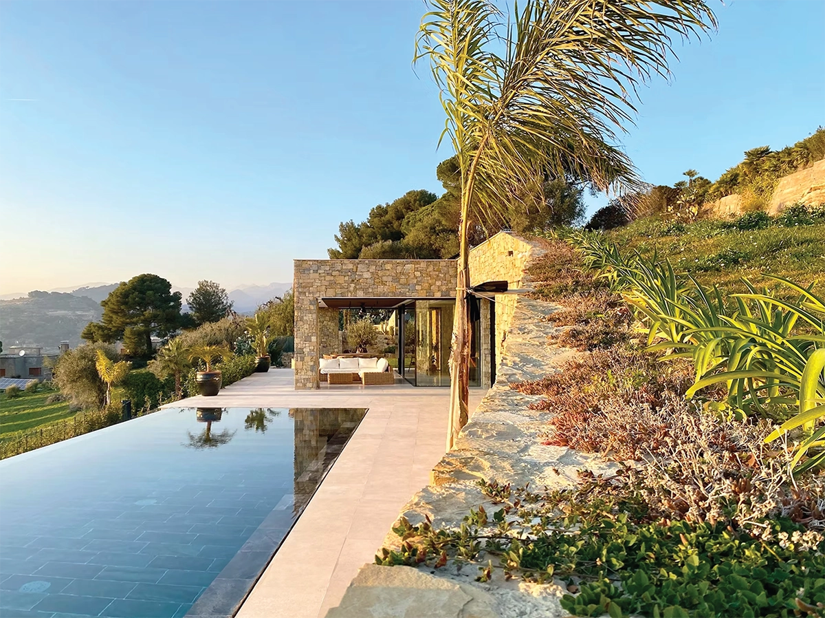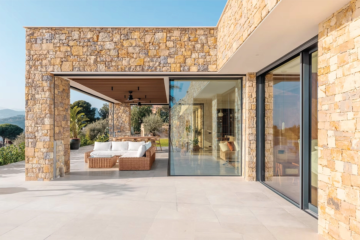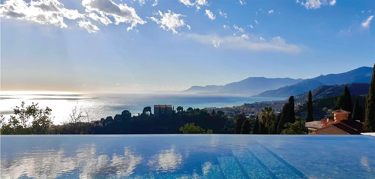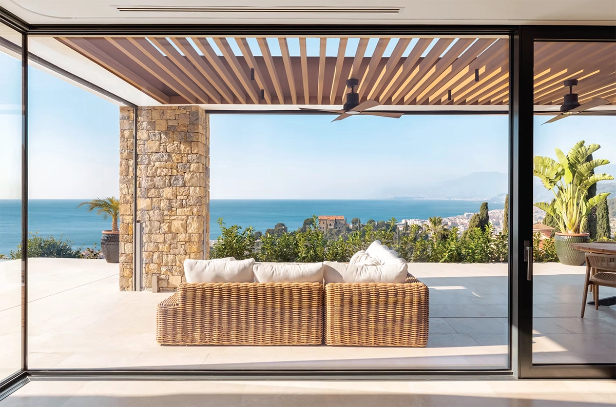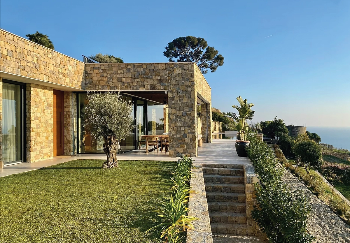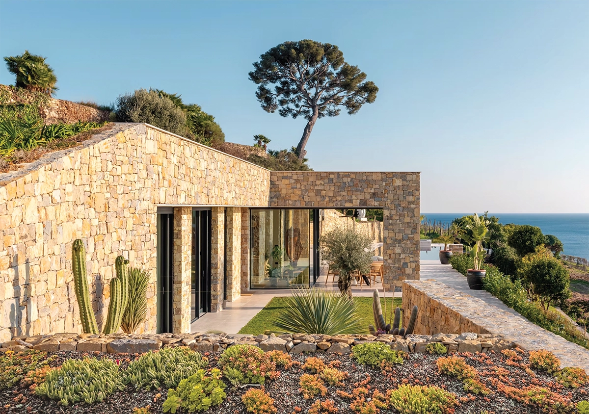 Villa Selva Dolce is a 250 sqm single-family home nestled in the hills of Bordighera, with sweeping views from the Gulf to Montecarlo. Embedded into the Ligurian terraces, the villa blends seamlessly into its natural surroundings with stone facades, a green roof, and Mediterranean landscaping. Organized on one level, the layout revolves around internal courtyards that bring in light, air, and vegetation. A central stone patio connects indoor and outdoor spaces, leading to an open-plan living area framed by 12 meters of floor-to-ceiling glazing and panoramic views. To the side, a Botticino stone sun deck surrounds the infinity pool and whirlpool. The interior features bespoke oak furniture, warm timber, and natural stone, with a timeless, minimal design. Each space—bedrooms, bathrooms, and living areas—is illuminated by skylight patios, creating a constant dialogue with nature. Sustainable in both form and function, the villa uses passive energy strategies and local materials to achieve near-zero environmental impact and exceptional living comfort.