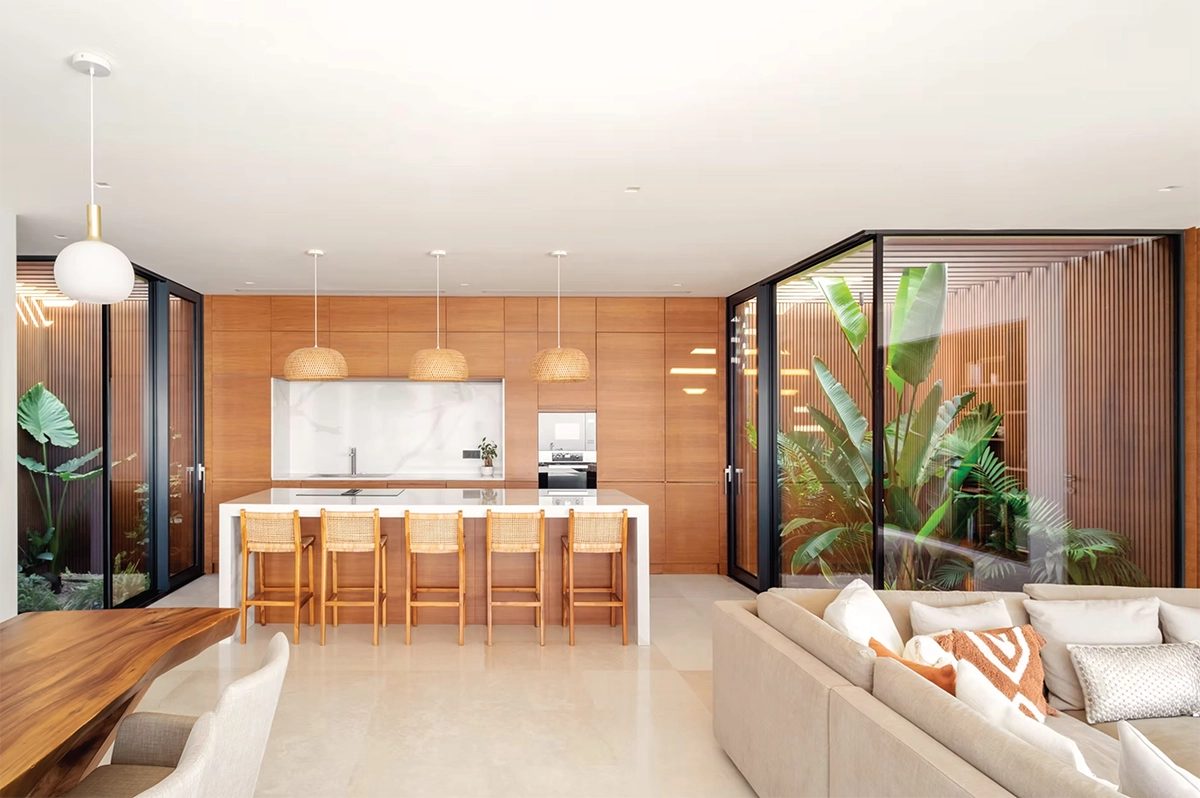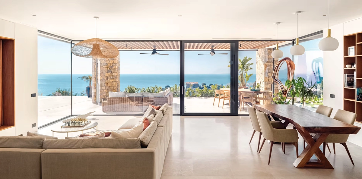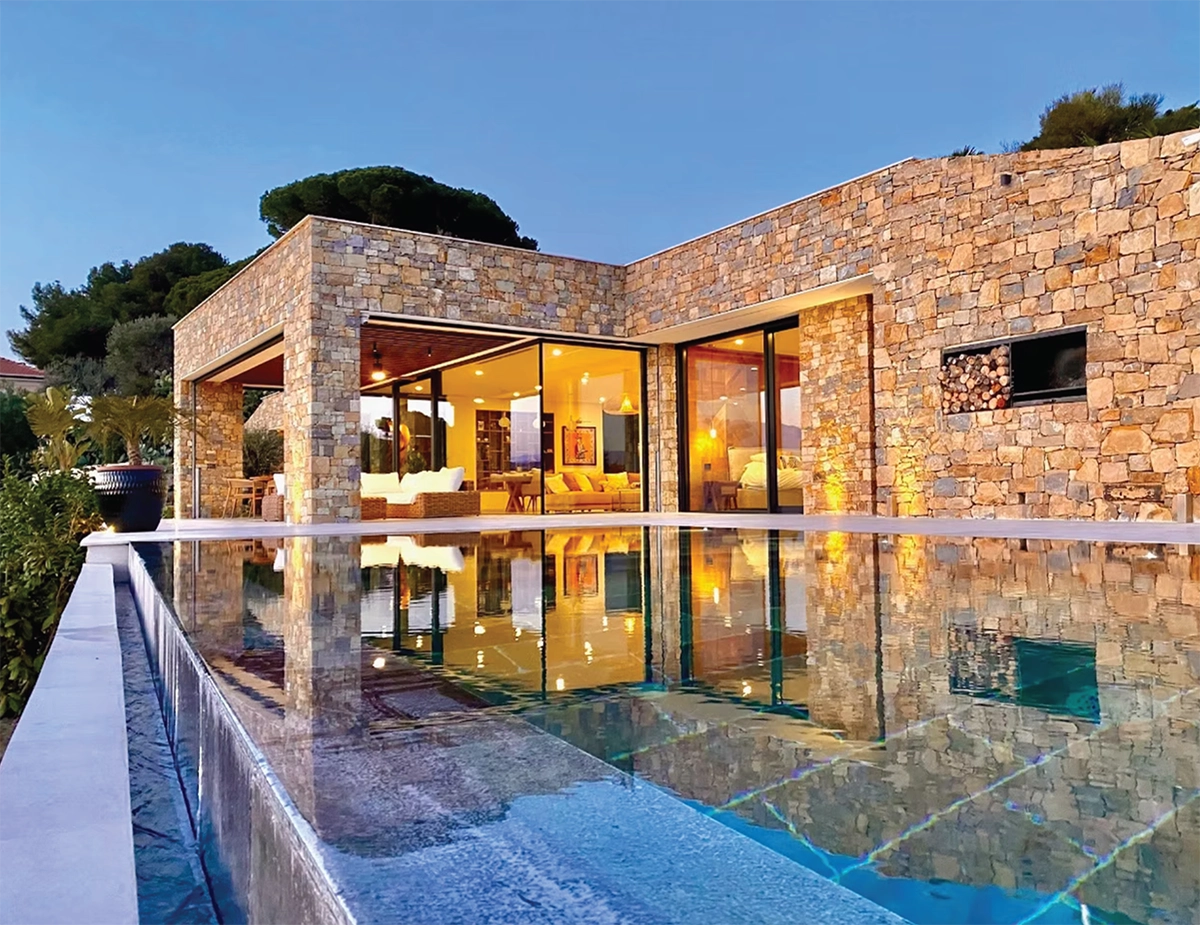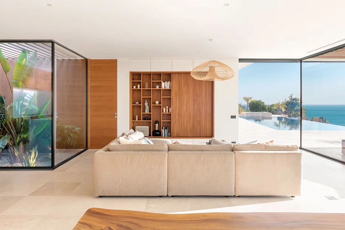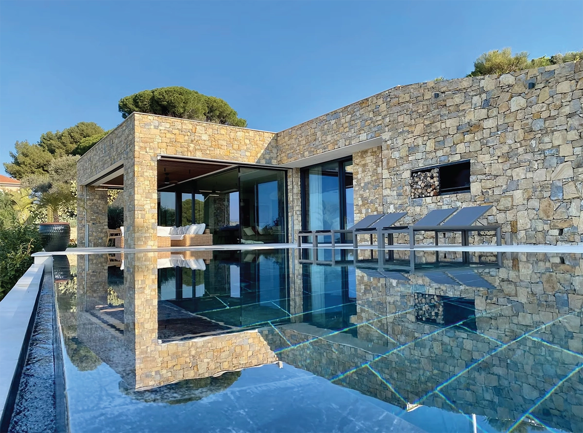 Villa Selva Dolce is a 250 sqm single-family home nestled in the hills of Bordighera, with sweeping views from the Gulf to Montecarlo. Embedded into the Ligurian terraces, the villa blends seamlessly into its natural surroundings with stone facades, a green roof, and Mediterranean landscaping. Organized on one level, the layout revolves around internal courtyards that bring in light, air, and vegetation. A central stone patio connects indoor and outdoor spaces, leading to an open-plan living area framed by 12 meters of floor-to-ceiling glazing and panoramic views. To the side, a Botticino stone sun deck surrounds the infinity pool and whirlpool. The interior features bespoke oak furniture, warm timber, and natural stone, with a timeless, minimal design. Each space—bedrooms, bathrooms, and living areas—is illuminated by skylight patios, creating a constant dialogue with nature. Sustainable in both form and function, the villa uses passive energy strategies and local materials to achieve near-zero environmental impact and exceptional living comfort.